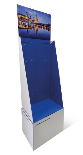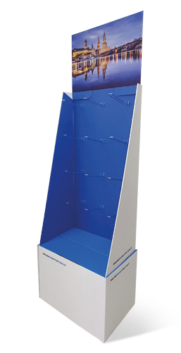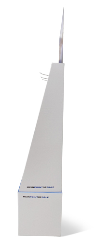 besteht aus zwei Teilen, diese werden mit einem Klebestreifen verklebt. Die Seitenwände werden mit gedoppelt und mit Klebestreifen versehen. Bei Ankunft Ihres Aufstellers müssen Sie nur noch die Seitenwände mit der rückwand fertig verkleben, Sockel aufrichten, Kreuz reinstellen und den Display auf den Sockel platzieren. Optional sind Flyerdispenser oder eine Einzelumverpackung möglich.