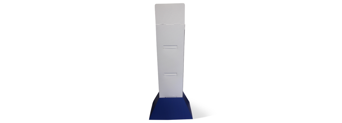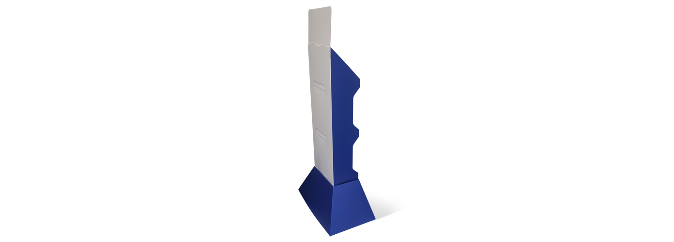 Dieser Display bringt Ihre Ware sehr eindrucksstark in 3 Regalen unter. Im Flächen-Format 60 x 40 cm passt der Display auf eine Chep-Palette (1/4 -Palette). Von unten beginnend steht der Sockel auf der Chep-Palette. Dieser ist fest 29 cm Hoch und verändert seine Grundfläche nach oben hin, je nachdem welche Breite und Tiefe Sie eingeben. Unter dem Sockel verbirgt sich ein Kreuz aus EB-Welle, wodurch im untersten Regal schwere Produkte abgelegt werden können und ebenfalls der Stabilität dient.