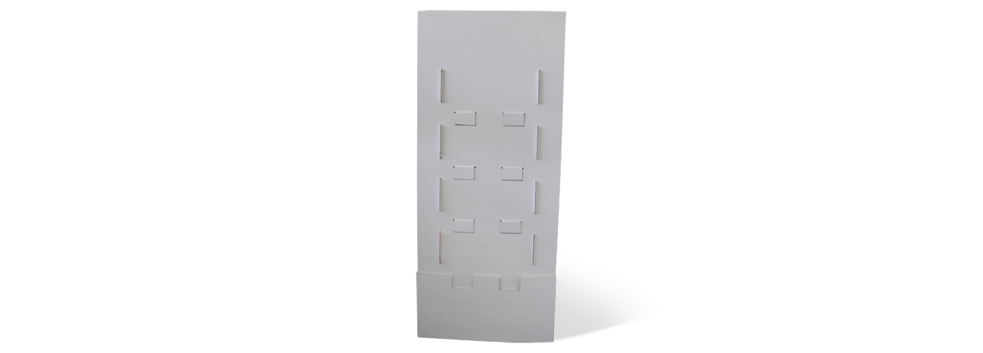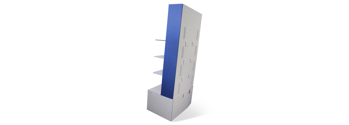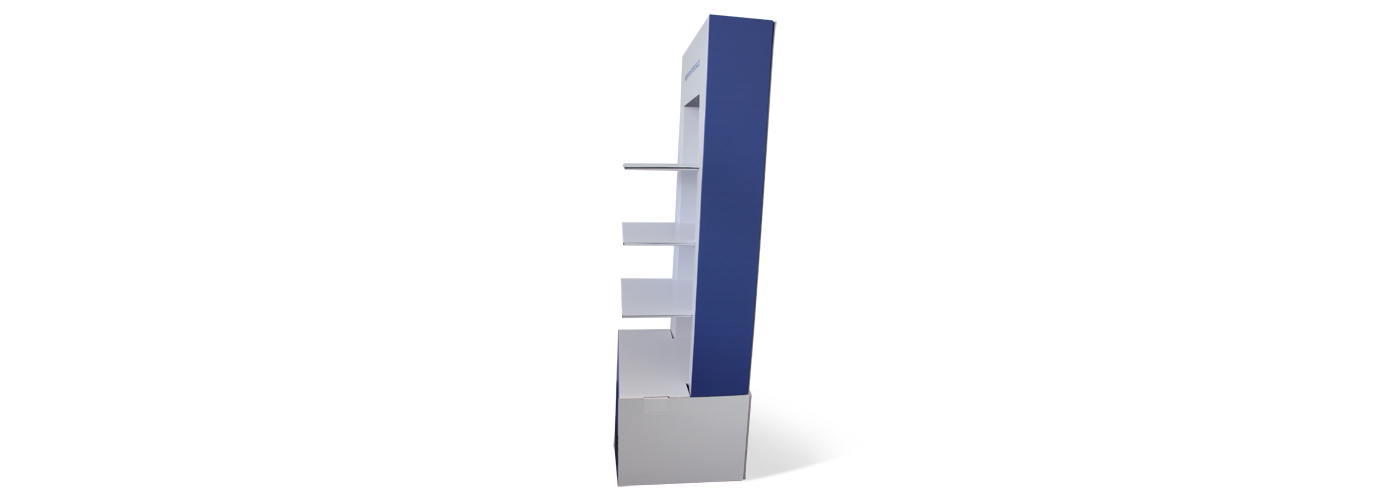 Im Flächen-Format 60 x 40 cm passt der Display auf eine Chep-Palette (1/4 -Palette) und ist gesamt 140 cm hoch. Das Top-Schild ist in der Konstruktion integriert und befindet sich perfekt im Blickfeld. Der Sockel ist 30 cm hoch, der Abstand der Regale beträgt 20 cm. Die Regale haben eine Fläche von 40 x 45 cm und werden auf EE-Welle produziert. Der Sockel wird durch ein verstecktes Innenkreuz stabilisiert.