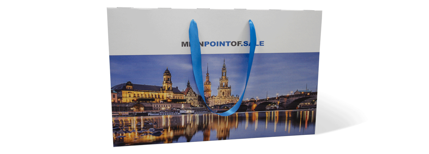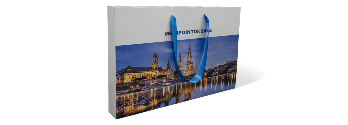 Ihre XXL Tragetasche wird zweimal verklebt und flachliegend verpackt.Die Satinbänder werden ebenfalls geschnitten, eingefädelt und verknotet.