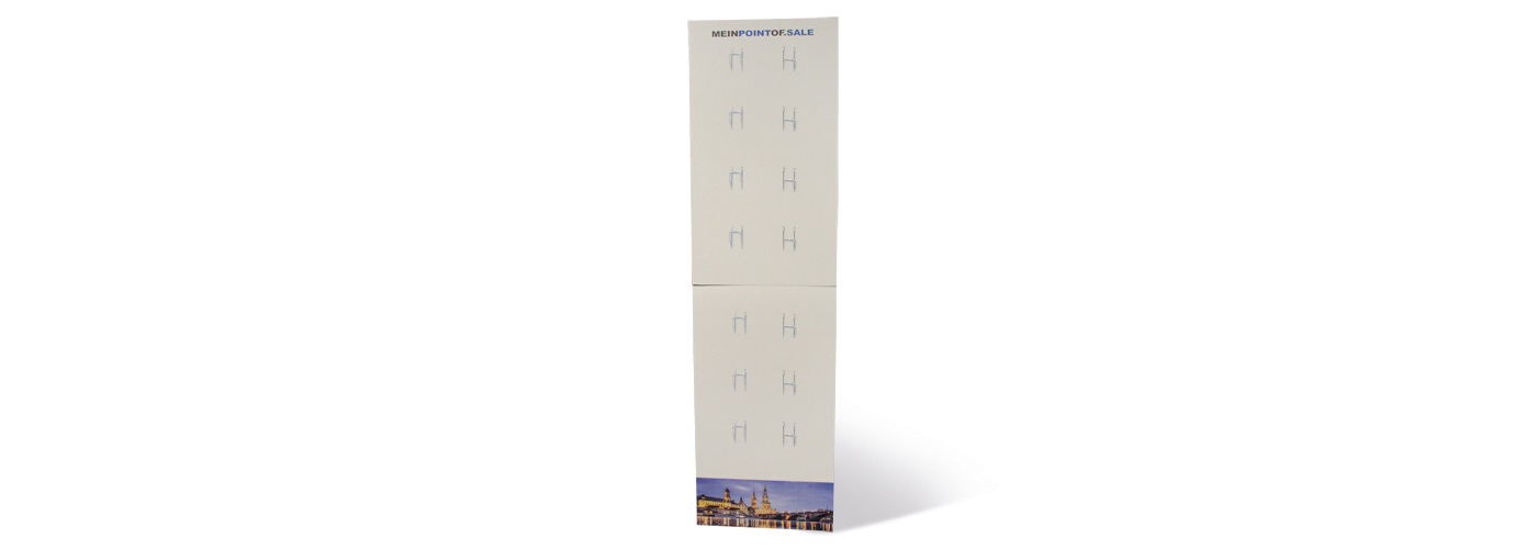 Standardmäßig werden die Displays einmal mittig gefaltet und flachliegend verpackt. Die Displayhaken werden separat dazugepackt. Optional können Sie jedoch auch eine passende Einzelumverpackung wählen.