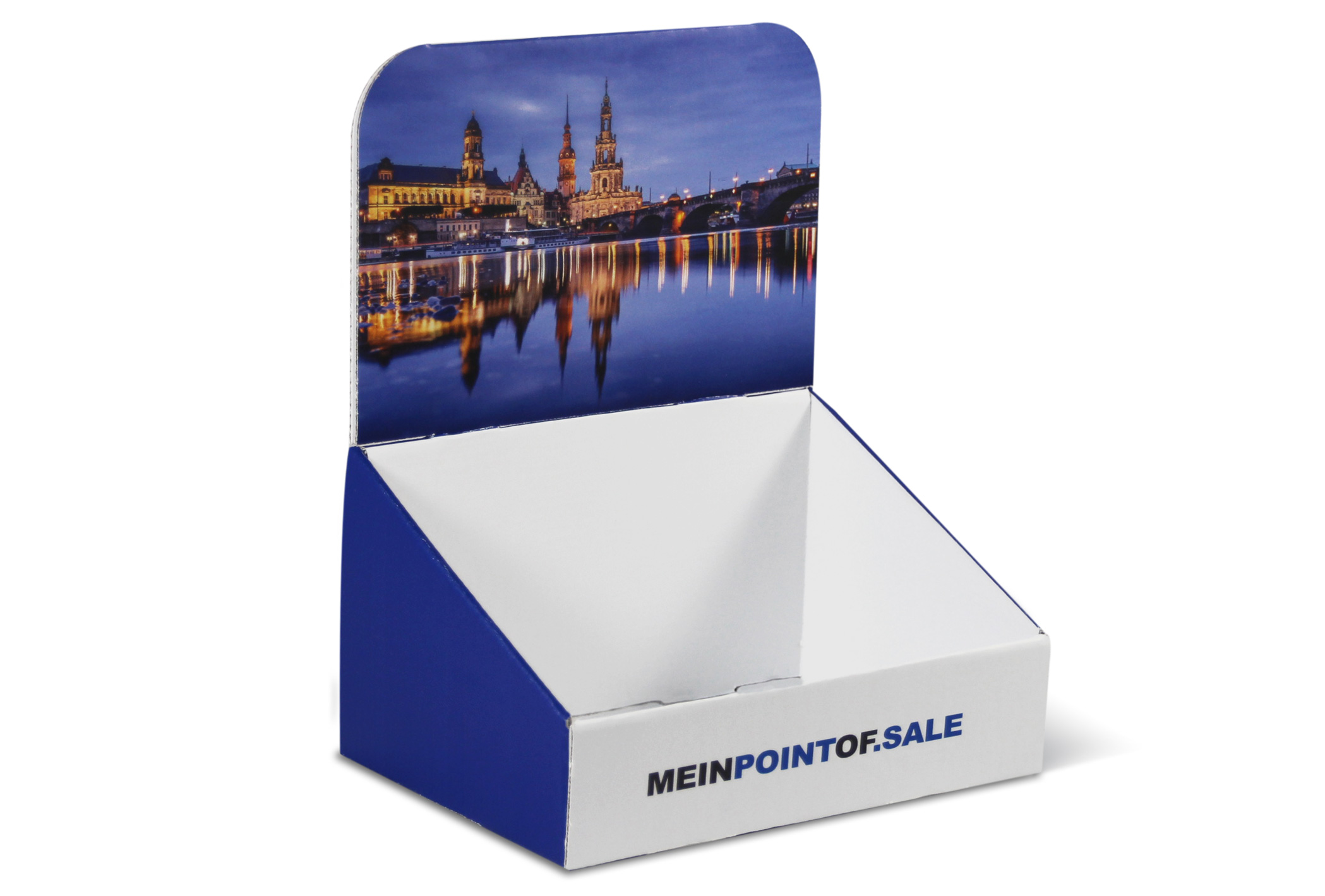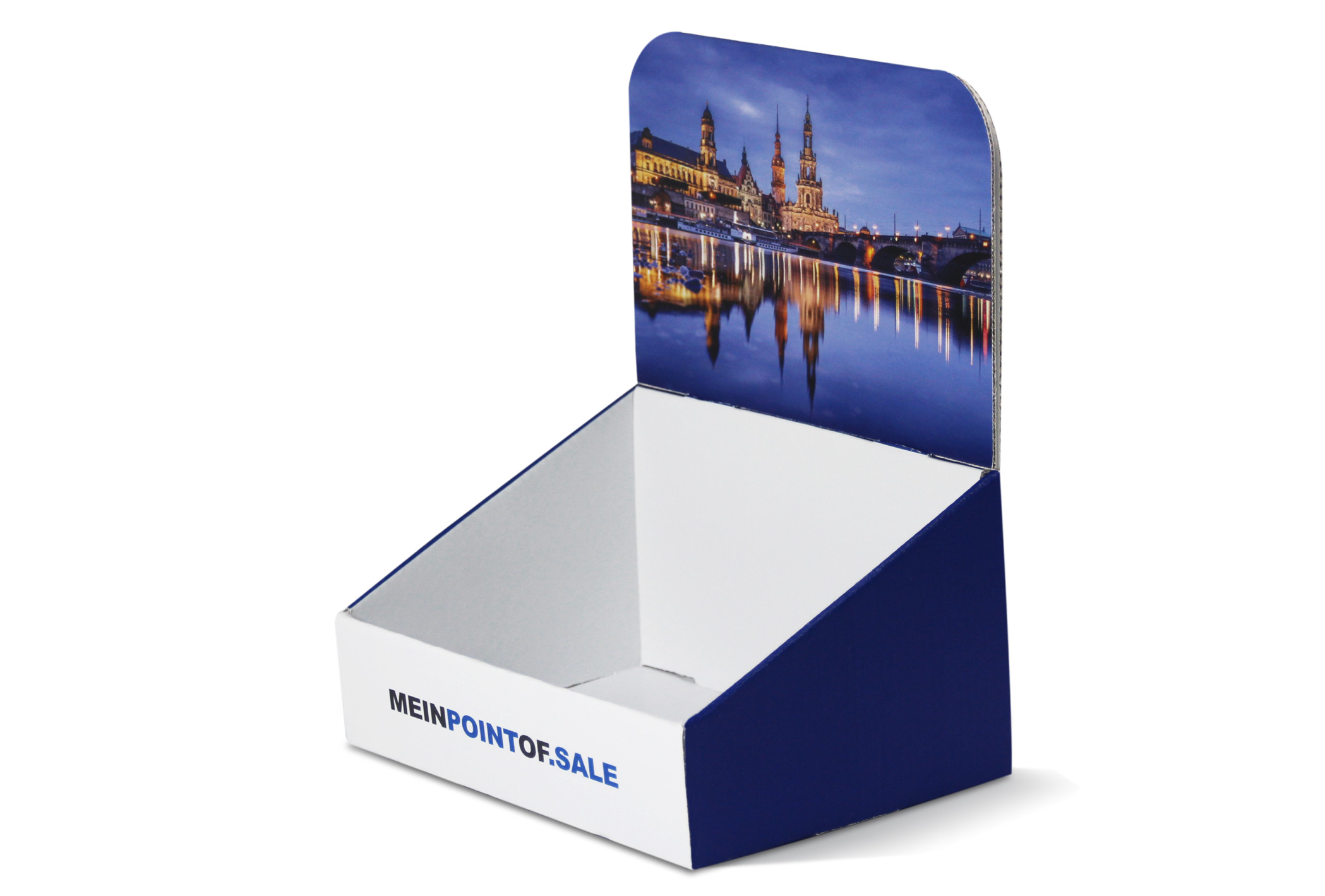 Der Produkt-Thekenaufsteller nach Ihren Wünschen: freie Maße, freies Druckbild und mit Treppe oder Flyerdispenser möglich.