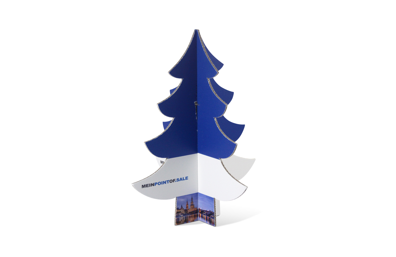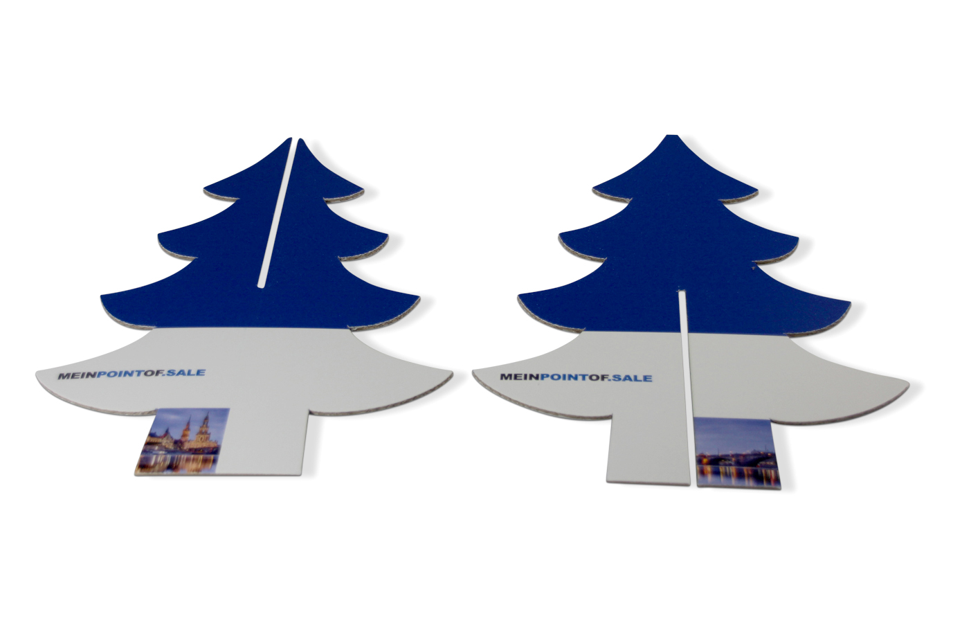 Bei dem Figuraufsteller Tannenbaum handelt es sich um einen dekorativen Aufsteller. Sie können Ihn in jeder beliebigen Höhe mit Ihrer individuellen Schneidekontur und mit Ihrem persönlichen Druckbild bestellen. Die Breite des Aufstellers ergibt sich proportional automatisch aus der Höhe. Der Tannenbaum besteht aus 2 Teilen, eines mit einem Schlitz oben mittig, und eines mit einem Schlitz unten mittig. Diese werden dann zusammengesteckt, wodurch der Baum freisteht und einen 3D Effekt erzeugt.