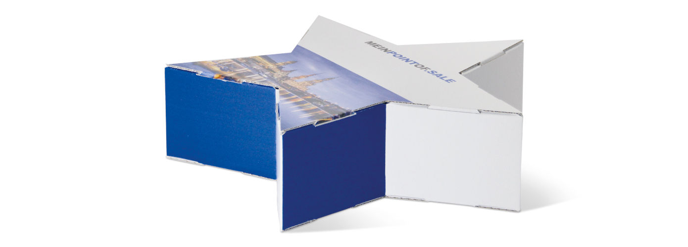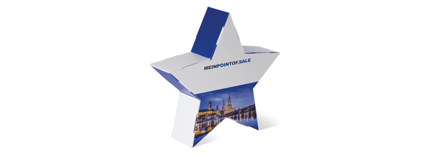 Erzeugen Sie den einzigartigen Wow-Effekt, indem Sie Ihr Produkt in einer individuellen Stern-Verpackung einpacken! Das Format ist bereits auf 28x28 cm angelegt. Sie müssen die große Fläche nur noch mit Ihrem individuellen Druckbild versehen. Gerade zur Weihnachtszeit ist diese Verpackung der wahre Hingucker und hinterlässt ordentlich Eindruck bei Ihrem Kunden.