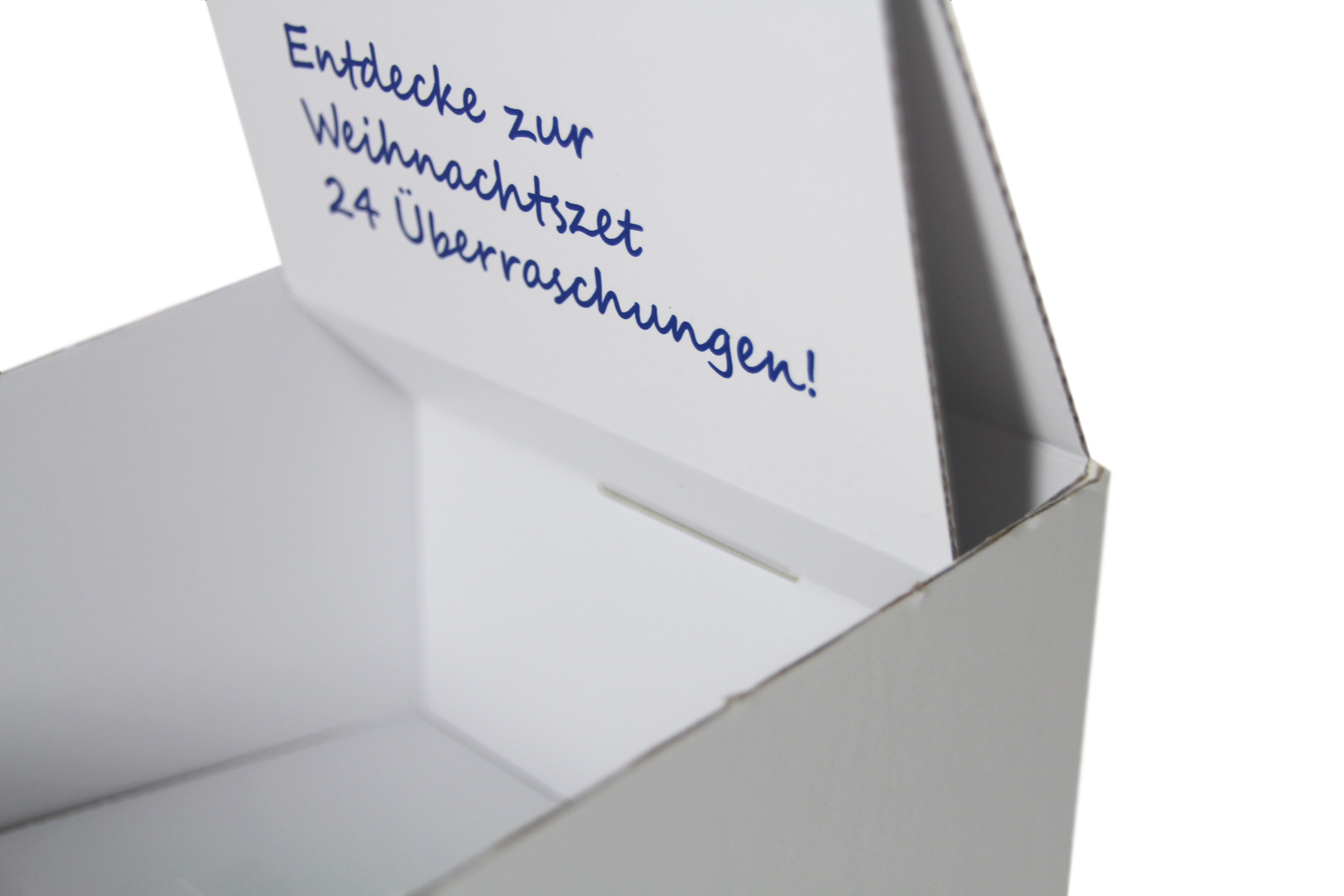 Überraschen Sie Ihren Kunden mit einem individuellen Adventskalender. Nutzen Sie diese Werbefläche und seien Sie den ganzen Dezember beim Kunden auf dem Tisch präsent. In der Box befinden sich 24 gleich große Schachteln. Befüllen Sie die Boxen nach Ihrem Belieben und mit Ihren Produkten. Ihrer Fantasie sind keine Grenzen gesetzt!