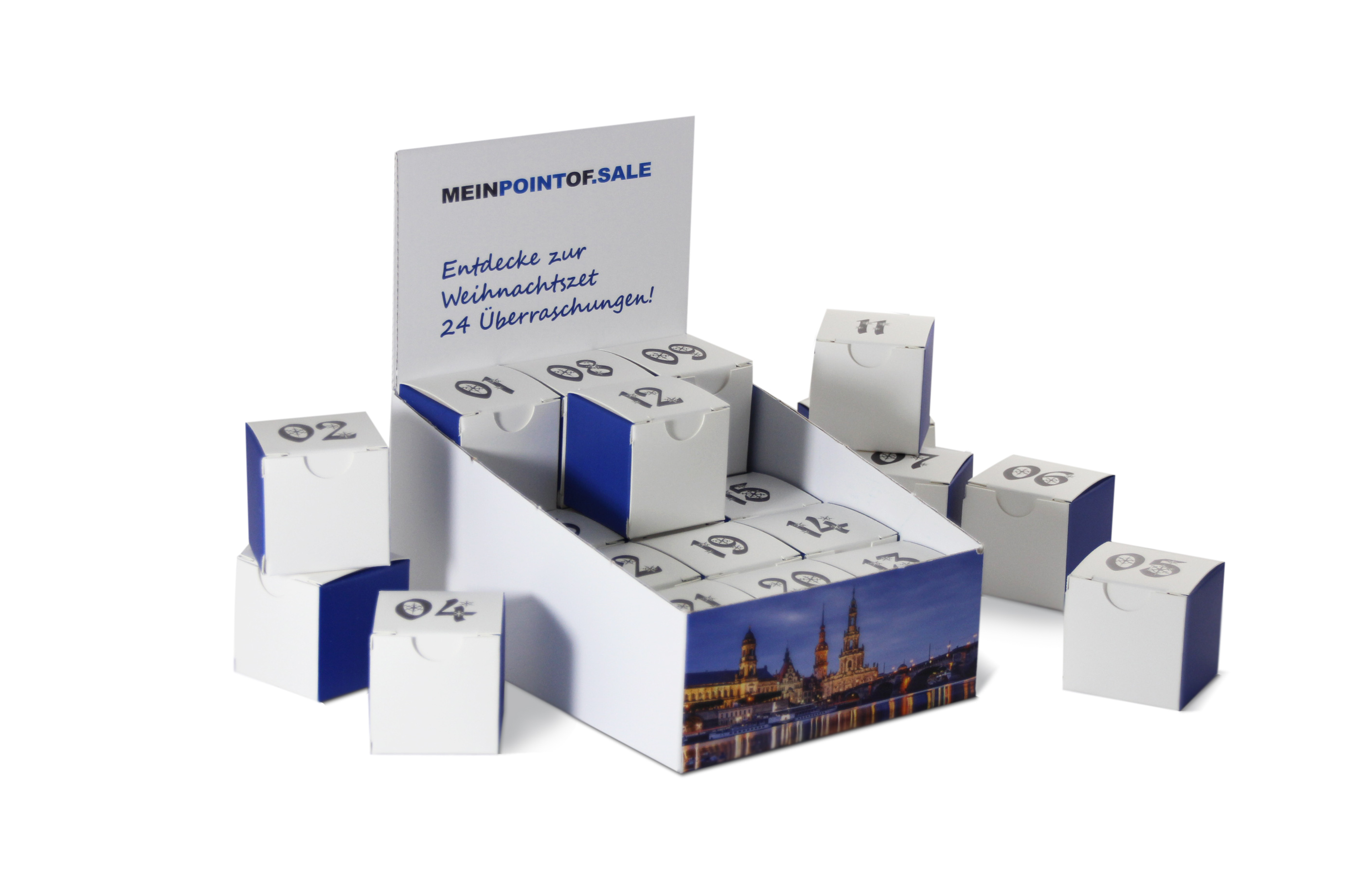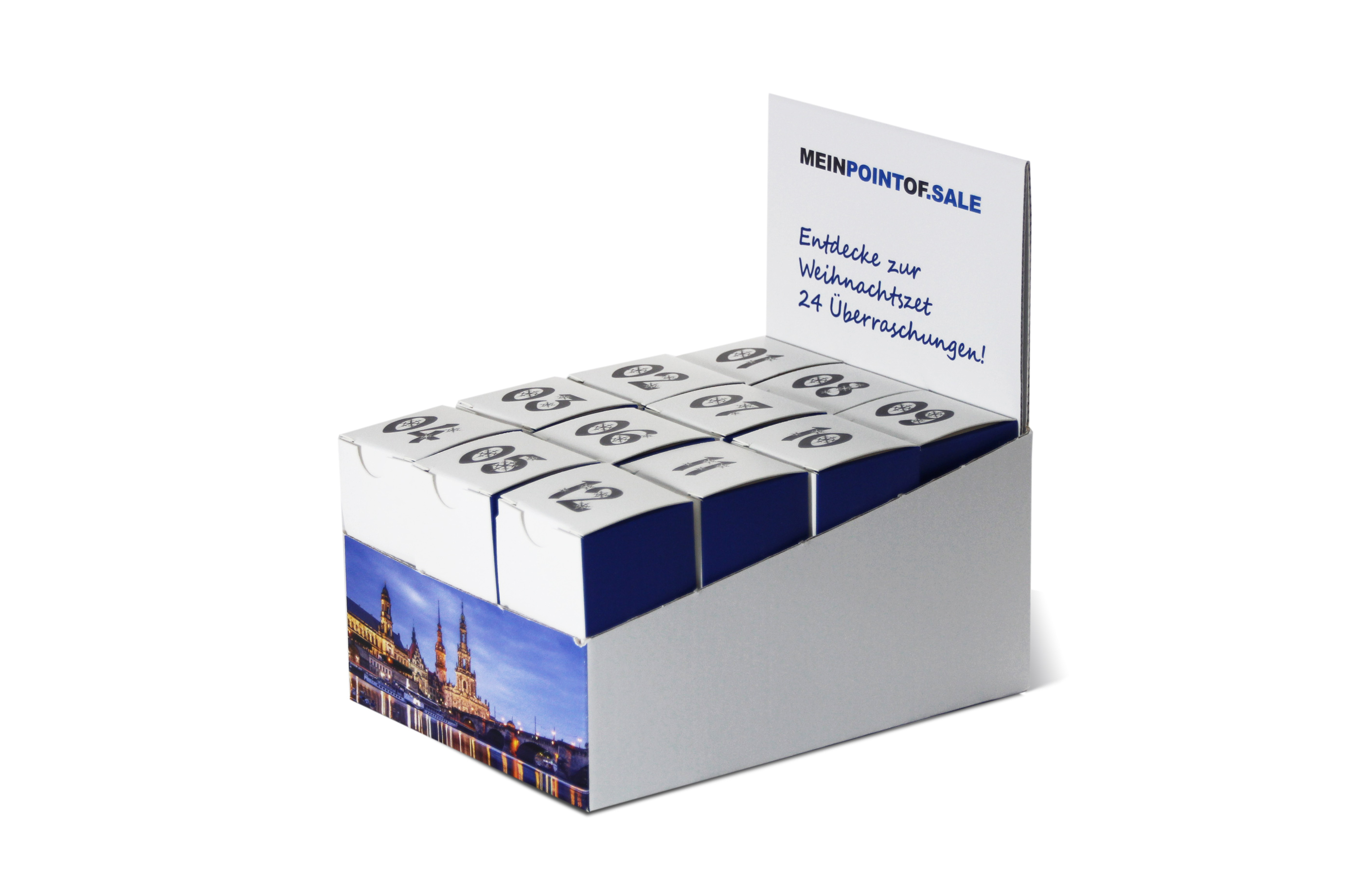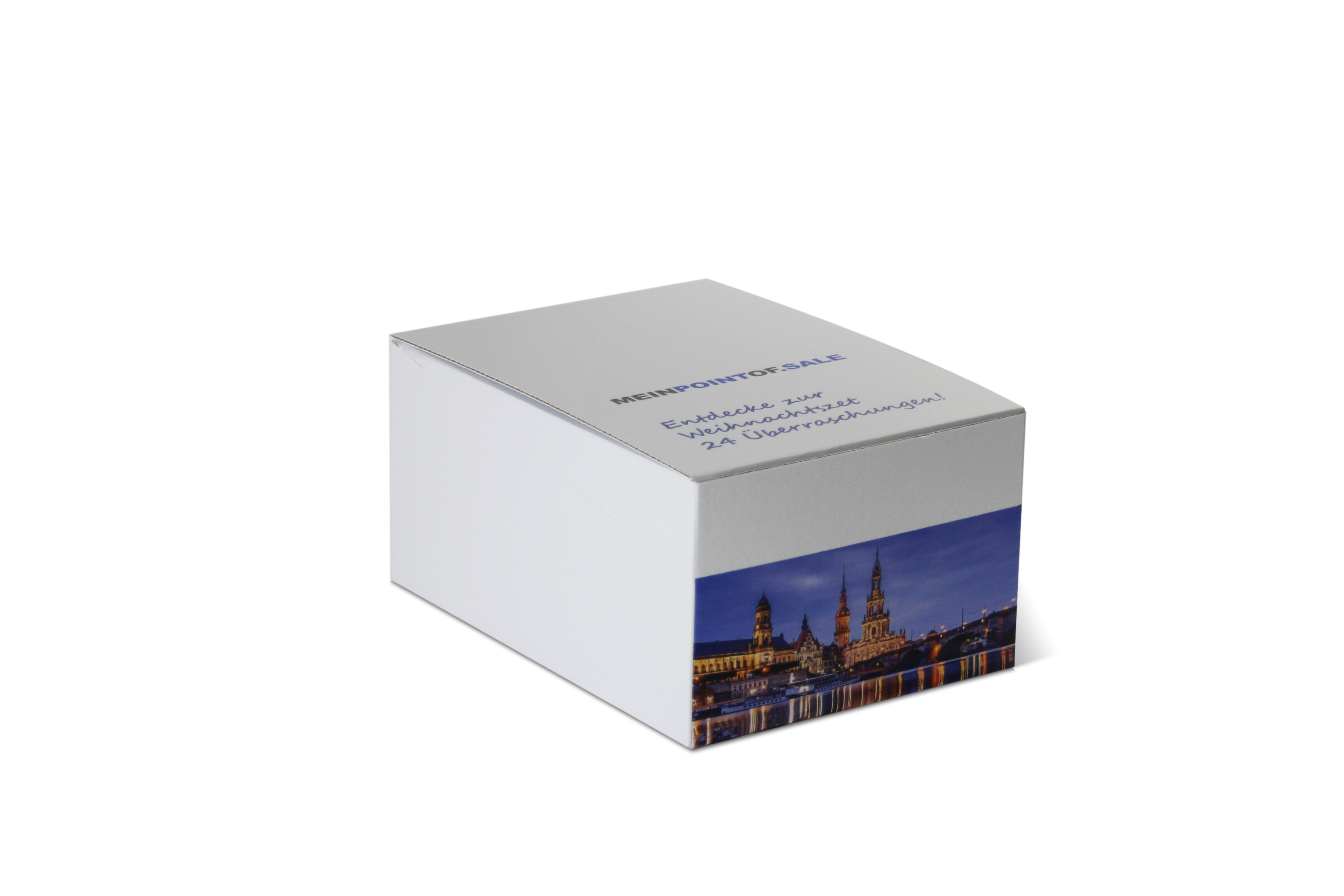 Überraschen Sie Ihren Kunden mit einem individuellen Adventskalender. Die Box ist wie ein Thekenaufsteller konstruiert und hat die festen Maße von 16 x 24,1 x 13,8 cm. Sie müssen sich somit nur noch für Ihr individuelles Druckbild entscheiden. Nutzen Sie diese Werbefläche und seien Sie den ganzen Dezember beim Kunden auf dem Tisch präsent. Die Box kann verschlossen verschickt werden, der Deckel wird hinten eingesteckt und somit zum Topper. In der Box befinden sich 24 gleich große Schachteln von 5 x 5 x 5 cm. Die Schachteln werden in 2 Reihen zu 12 Stück in die Box gesteckt. Befüllen Sie die Boxen nach Ihrem Belieben und mit Ihren Produkten. Ihrer Fantasie sind keine Grenzen gesetzt!